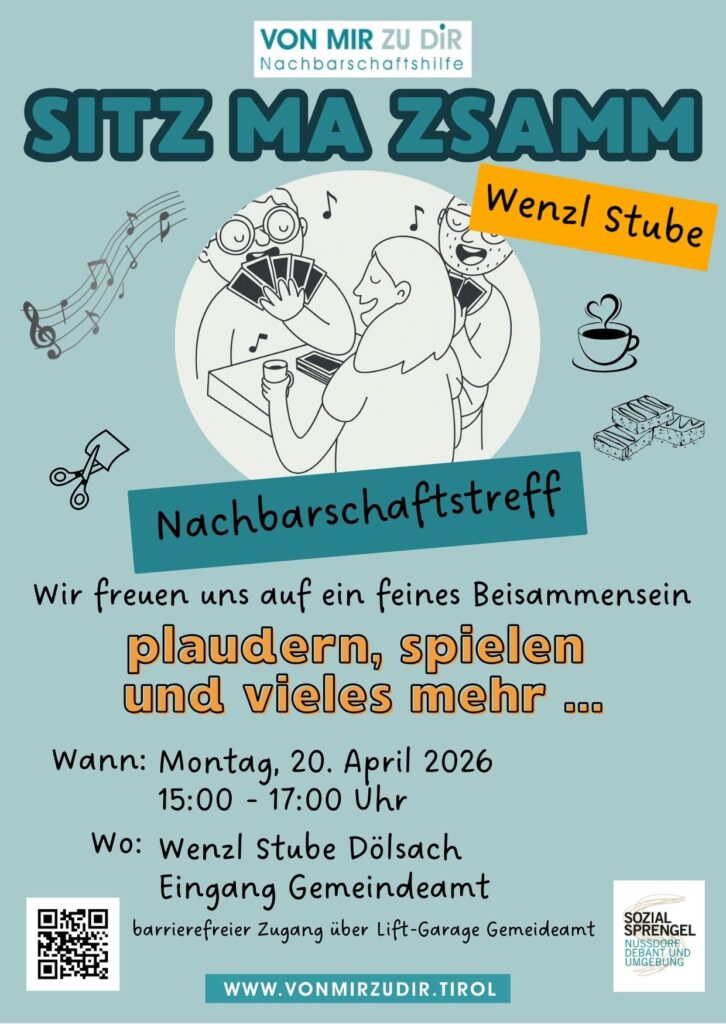 “Sitz ma Zsamm” — in da Wenzl Stube. Wir freuen uns auf ein feines Beisammensein mit plaudern, spielen und viele mehr.